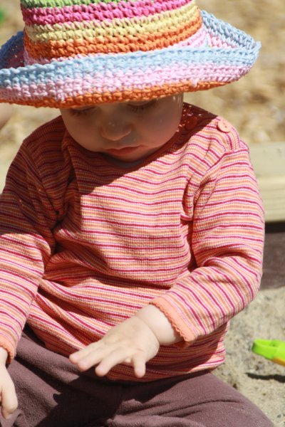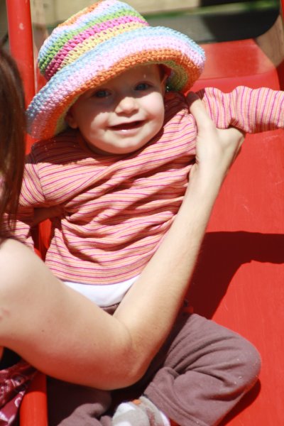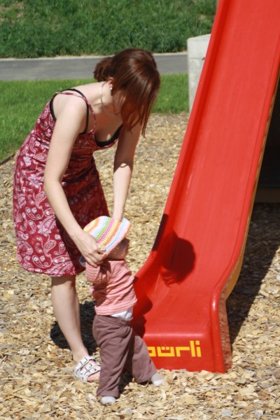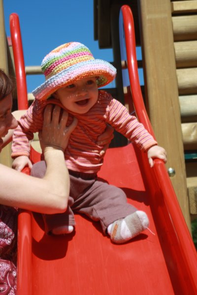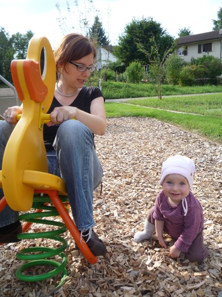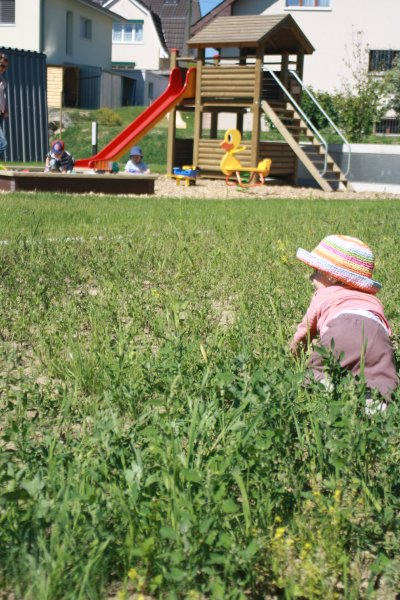 Juhu: ein Spielplatz direkt vor dem Esszimmerfenster. Man sieht die Rutsche vom Hochstuhl aus. Wenn wir künftig zu spät kommen: das ist der Grund. Emmilienchen Struppilienchen macht sich alleine auf den Weg zum Spielen ![]()